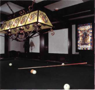 Тяжелые кованые светильники с витражными вставками в сочетании с темными деревянными панелями и перекрестиями потолочных балок создают в бильярдной атмосферу старого рыцарского замка