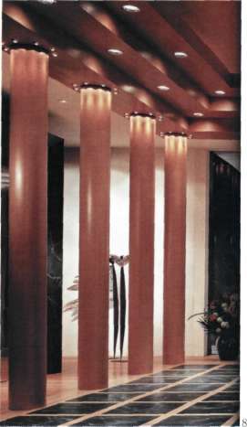 Пример использования различного типов светильников "Down-light"в холлах с высокими потолками. В то время как слоты, смонтированные по периметру колонн выполняют чисто декоративную функцию подсветки, основной уровень освещенности интерьера обеспечивается потолочными металл-галогеиовыми слотами с малыми углами расходимости светового луча. Использовано световое оборудование компании Zumtobel Staff (Германия) Для ознакомление с освещенностью читайте нормы освещенности