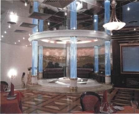10. Интерьер казино в Москве. Наряду с общим освещением интерьера использован эффект подсветки пузырьков воздуха, движущихся в воде внутри стеклянных колонн. Благодаря частично зеркальной поверхности потолка, возникает оптическая иллюзия двухярусной светящейся колонады. Освещение выполнено компанией "МОДУЛЬ".